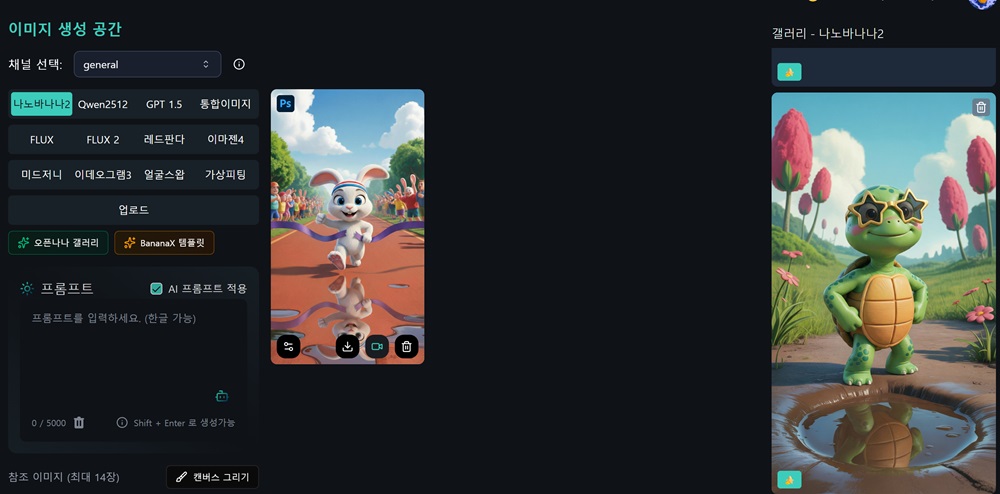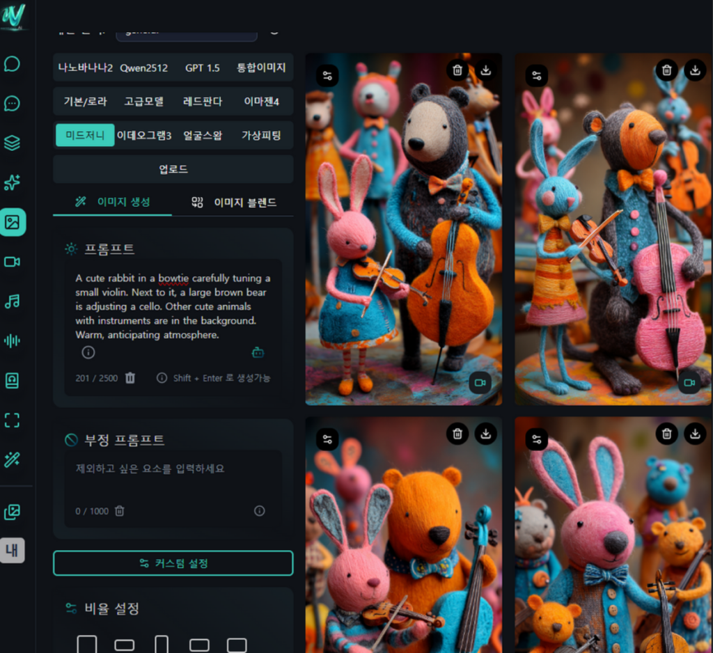 한글 프롬프트로 이미지 / 영상 / 음악 / 음향효과 / 음성합성을 한번에 생성하며 전문가의 손끝에서 탄생한 국내 AI 창작자를 위한 맞춤형 도구입니다.