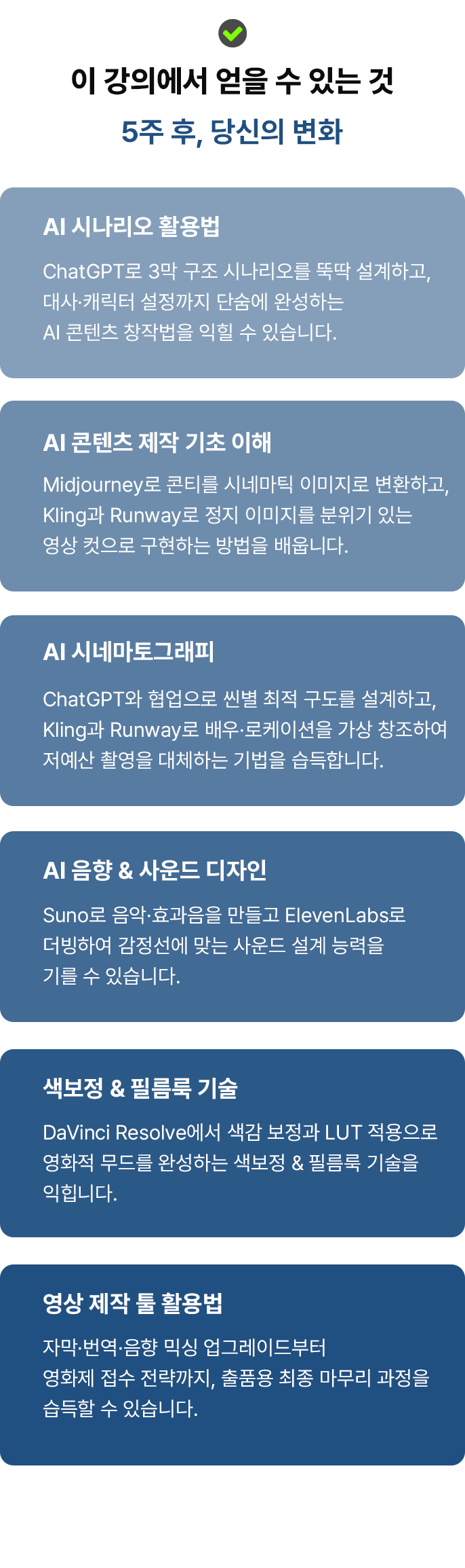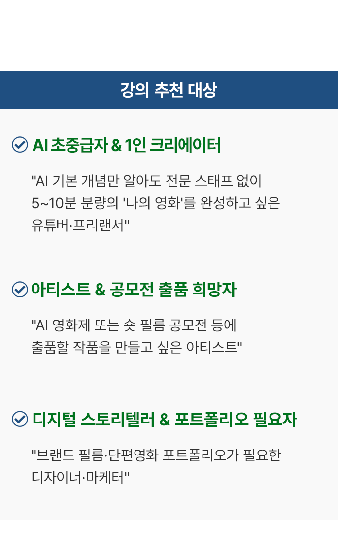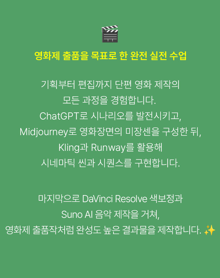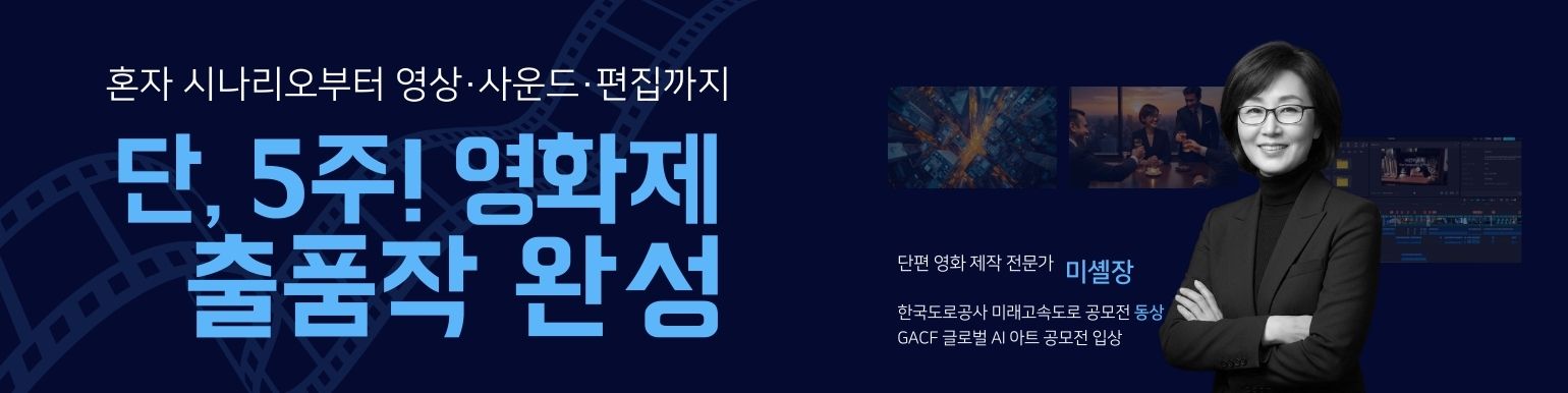 | 5차시 (3/24-화) | 파이널 컷 & 페스티벌 서브미션 전략 “드디어 완성! 당신의 첫 AI 시네마틱 필름 프리미어 상영회! 🎬✨” |