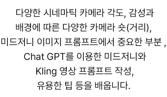 | 2차시 (3/3-화) | 비주얼 디벨롭먼트 & 시네마틱 이미지-투-비디오 “프롬프트에서 무비 프레임으로! 텍스트가 영상으로 변환되는 마법을 경험하세요!” |