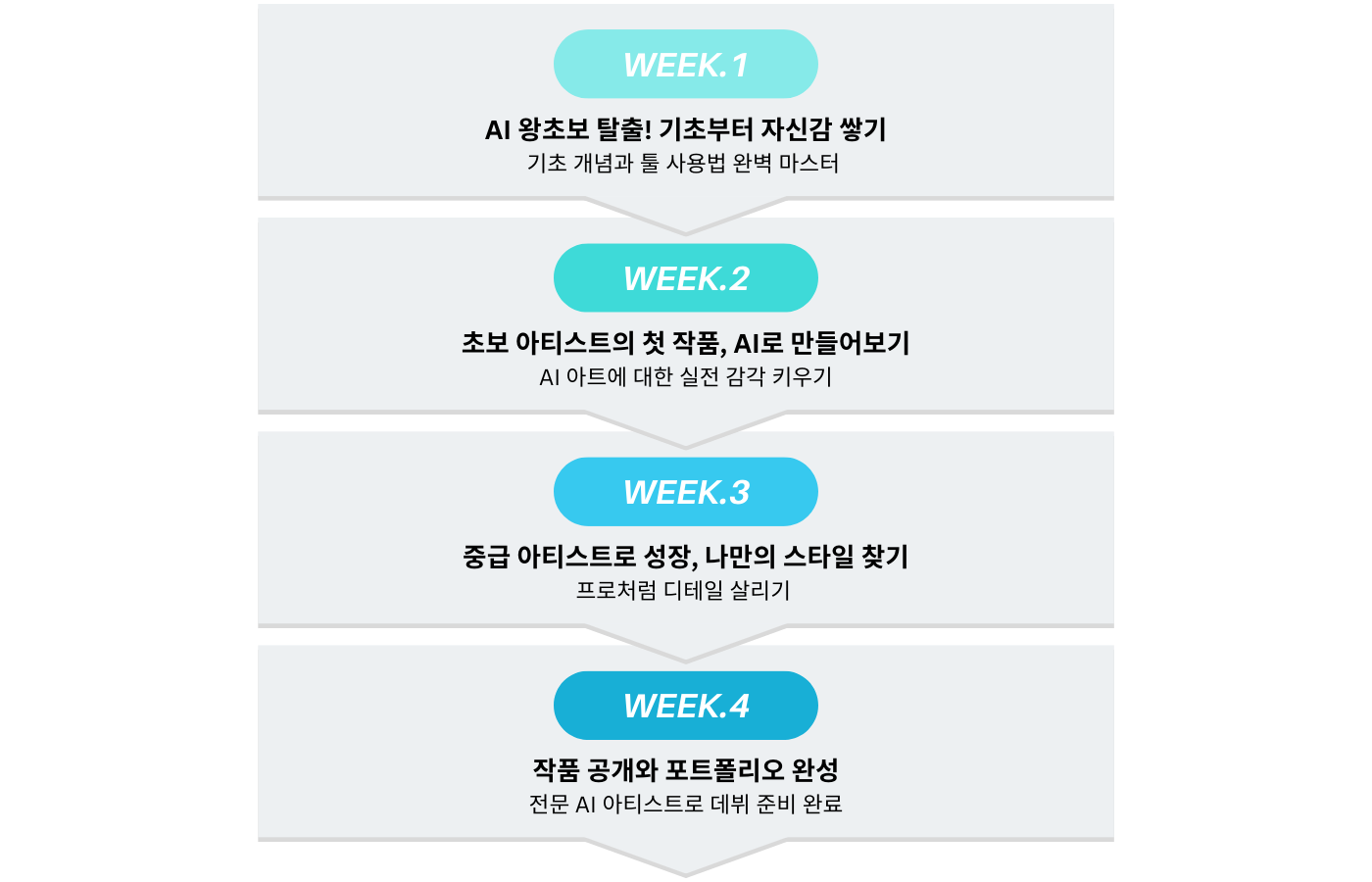 4주 후, 당신은 세상에 자신만의 작품을 선보이는 멋진 AI 아티스트가 되어 있을 겁니다.