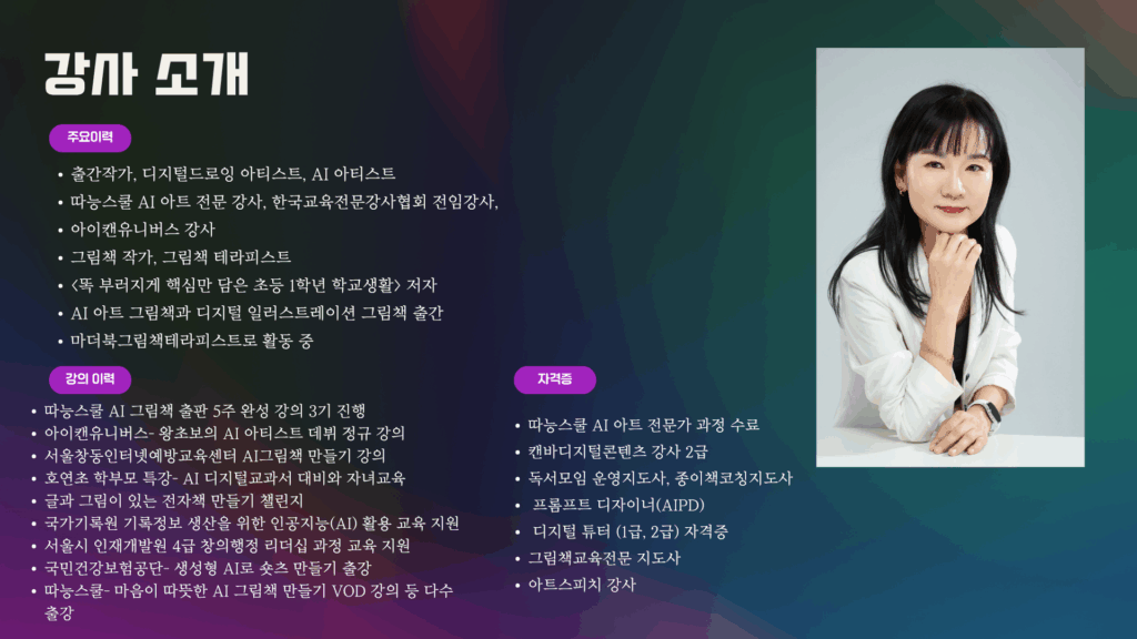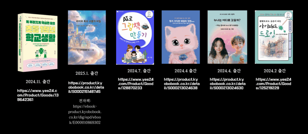AI로 그림책 만들기 외 전자책 3권 출간 Ι [똑 부러지게 핵심만 담은 초등 1학년 학교생활] 저자 Ι그림책 일러스트레이션과 그림책 제작을 접목한 실전 교육과정 이수(그 림책상상학교, 한국그림책학교 등 다수)