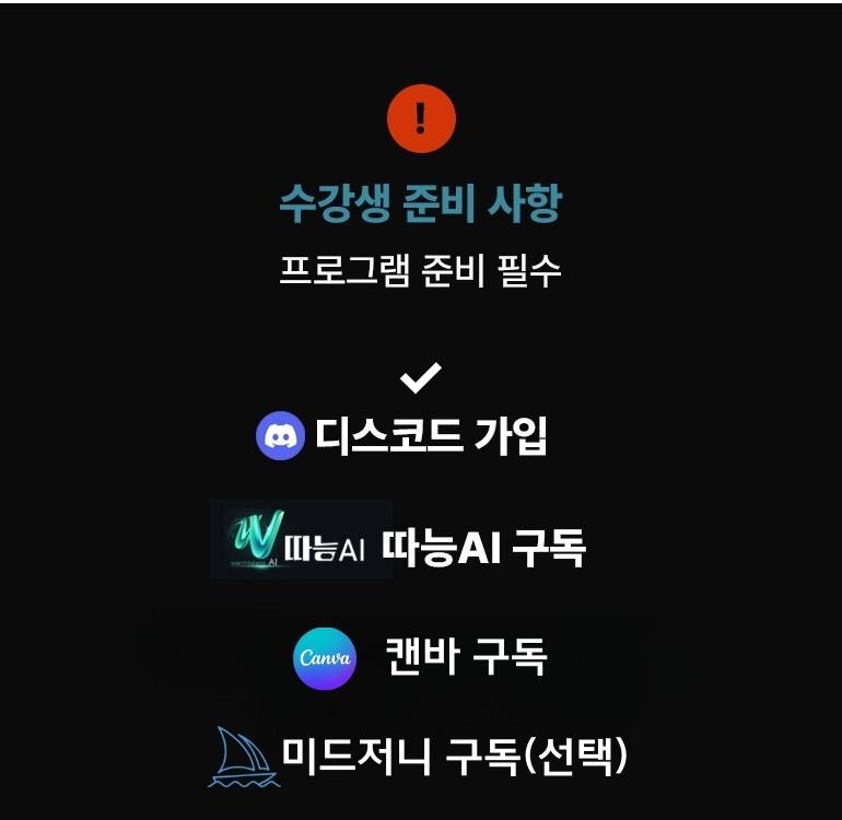 - 따능 AI, Midjourney, ChatGPT, Canva 등 최신 생성형 AI 툴을 단계별로 안내