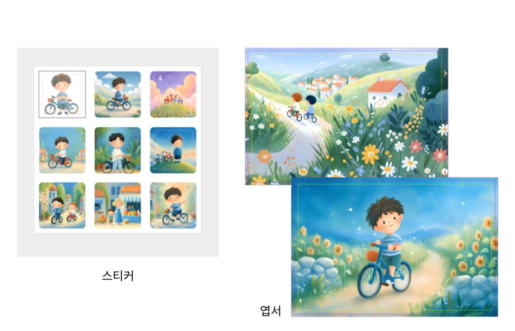 | 3주차 (12/30-화) | 내지·표지 제작 + 굿즈 만들기 | – 그림 배치법 심화 (텍스트와 그림의 위치, 여백 활용) – Canva로 내지 제작 실습 – 양장 표지 디자인 제작 실습 – 굿즈 디자인: 엽서·키링·스티커용 이미지 만들기 – 양장 표지 |