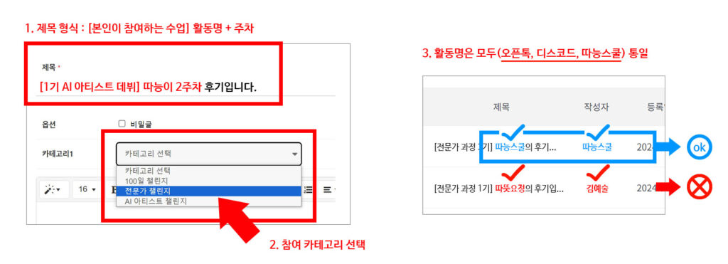 제목 형식카테고리를 맞춰 주세요. (그림 참조) 활동명작성자 명은 통일 (활동명 변경은 회원정보에서 수정)